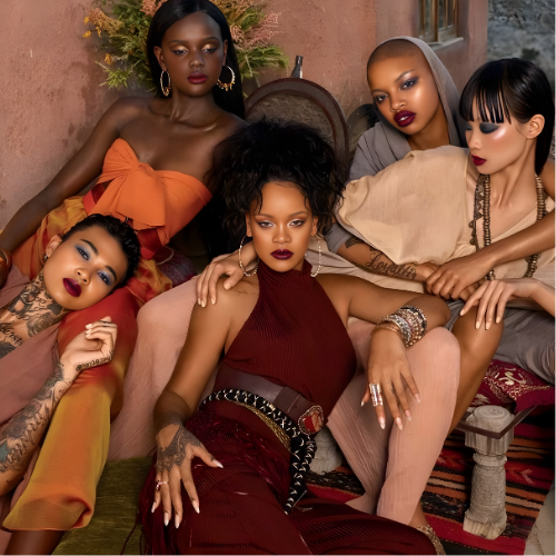 Rihanna sits confidently surrounded by diverse models with bold makeup, rich textures, and fierce energy, showcasing Fenty Beauty’s inclusive vision.